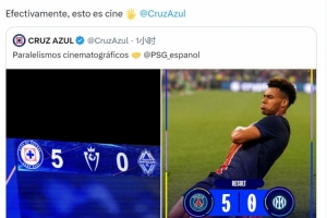 蓝十字社媒晒出中北美冠军杯决赛、欧冠决赛的比分,蓝十字和巴黎都是5-0取胜,配文:“宛如电影的巧合。”